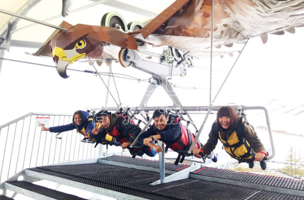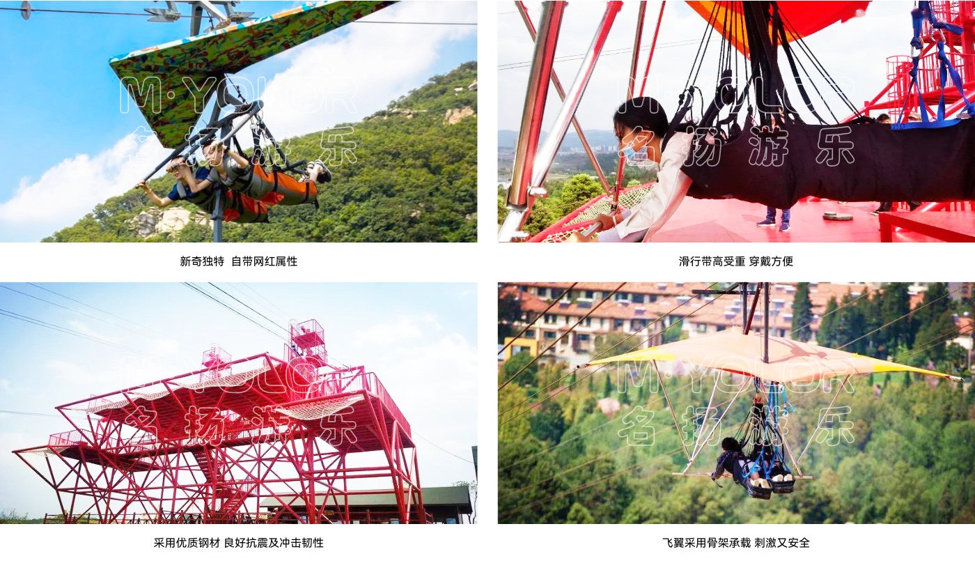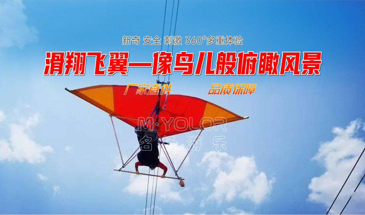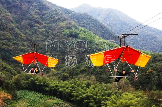 滑翔飛翼是一種空中索道式的無動力游樂項目,運用架空懸吊的方式凌空而起,利用一高一低的塔架之間的高度差自動滑行。和滑索、吊橋等無動力游樂設(shè)備一樣,滑翔飛翼同樣深受游客喜愛,游客坐在滑翔飛翼上,居高臨下,可將整個景區(qū)的景色盡收眼底,充滿刺激性,很多景區(qū)也已經(jīng)增設(shè)了這一娛樂項目。